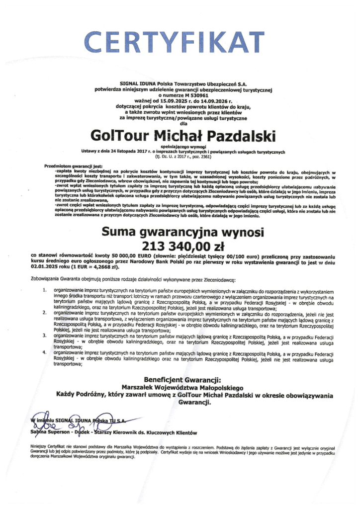 GOLTOUR to biuro podróży, które stawia na bezpieczeństwo, profesjonalizm i pełne zaufanie klientów. Działamy legalnie i transparentnie – posiadamy ważną Gwarancję Turystyczną, która chroni naszych uczestników w każdym etapie podróży.